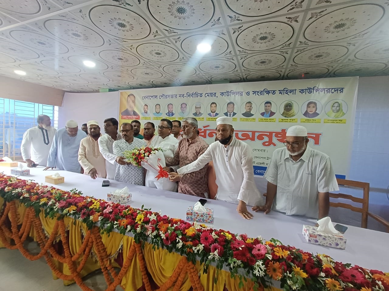 মোঃ সাইদুল ইসলাম, বেনাপোল প্রতিনিধিঃ- বেনাপোলের নব নির্বাচিত পৌর মেয়র এবং পৌর আওয়ামীলীগের সাধারণ সম্পাদক আলহাজ্ব মোঃ নাসির উদ্দীনকে বেনাপোল ট্রান্সপোর্ট এজেন্সি মালিক সমিতির নিজস্ব ভবন অফিস কার্যালয়ে সোমবার (২৪ জুলাই) সকালে ফুল এবং ক্রেস্ট দিয়ে শুভেচ্ছা ও সংবর্ধনা অনুষ্ঠিত হয়। সোমবার (১৭ জুলাই) অনুষ্ঠিত নির্বাচনে ১৩ হাজার ২৬৫ ভোট পেয়ে তিনি বেসরকারিভাবে মেয়র নির্বাচিত হয়েছেন আলহাজ্ব মোঃ নাসির উদ্দীন। তার নিকটতম প্রতিদ্বন্দ্বী মফিজুর রহমান সজন মোবাইল প্রতীক নিয়ে প্রতিদ্বন্দ্বিতা করে পেয়েছেন ৩ হাজার ৮২৫ ভোট। পরাজিত প্রার্থী সজনের ভোটের ব্যবধান ৯ হাজার ৪৪০ ভোট। আর সংরক্ষিত আসনে মহিলা কাউন্সিলর নির্বাচিত হয়েছেন,১,২,ও ৩ নং ওয়ার্ডের দ্বিতীয়বার মোছাঃ জুলেখা বেগম, , ৪,৫,ও ৬ নং ওয়ার্ডের মোছাঃ মর্জিনা আক্তার মিম,৭,৮,ও ৯ নং ওয়ার্ডের দ্বিতীয়বার সাবেক কাউন্সিলর কামরুন্নাহার আন্না নির্বাচিত হয়েছেন। সাধারণ আসনে পুরুষ কাউন্সিলর ১ নং ওয়ার্ড থেকে মোঃ সুলতান আহমেদ বাবু, ২ নং ওয়ার্ড থেকে মোঃ শরীফুল ইসলাম শরিফ, ৩ নং ওয়ার্ড থেকে মোঃ মিজানুর রহমান, ৪ নং ওয়ার্ড থেকে মোঃ কাজী শাহীনুল ইসলাম শাহিন, ৫ নং ওয়ার্ড থেকে মোঃ আজিম উদ্দীন গাজী এবং বেনাপোল ট্রান্সপোর্ট এজেন্সির মালিক সমিতির সাধারণ সম্পাদক ও ঝিকরগাছা বেনাপোল ট্রাক ও ট্রাক লড়ির সাধারণ সম্পাদক, ৬ নং ওয়ার্ড থেকে মোঃ আসাদুজ্জামান আসাদ, ৭ নং ওয়ার্ড থেকে আলহাজ্ব মোঃ মজনুর রহমান নুপুর, ৮ নং ওয়ার্ড থেকে মোঃ হাসানুজ্জামান তাজিন এবং ৯ নং ওয়ার্ড থেকে মোঃ কামাল হোসেন, নির্বাচিত হয়েছেন।ভোট গণনা শেষে যশোররে সিনিয়র জেলা নির্বাচন অফিসার মোঃ আনিছুর রহমান বেসরকারি ওই ফলাফল ঘোষণা করেন।বেনাপোল পৌরসভার ৯ টি ওয়ার্ডের ১২ টি ভোট কেন্দ্রে মোট ভোটার সংখ্যা ৩০ হাজার ৩৮৫ জন। তার মধ্যে পুরুষ ভোটারের সংখ্যা ১৫ হাজার ৪৪ জন ও নারী ভোটারের সংখ্যা ১৫ হাজার ৩ শত ৪১ জন।তারমধ্যে ১৭হাজার ৫ শত ৯৮ জন ভোটার তাদের ভোটাধিকার প্রয়োগ করেছেন।এই প্রথমবার বেনাপোল পৌর নির্বাচনে ইভিএম-এর মাধ্যমে নতুন অভিজ্ঞতার সাথে সাধারণ ভোটাররা তাদের ভোট দিয়েছেন।উক্ত সংবর্ধনা অনুষ্ঠানে উপস্থিত ছিলেন,বেনাপোল ট্রান্সপোর্ট মালিক সমিতির সুযোগ্য সভাপতি এ,কে,এম,আতিকুজ্জামান সনি,সহ-সভাপতি মোঃ ইদ্রিস আলী,সহ-সভাপতি মোঃ মশিয়ার রহমান, সাধারণ সম্পাদক মোঃ আজিম উদ্দিন গাজী, যূগ্ন সাধারণ সম্পাদক মোঃ খাইরুল ইসলাম, সাংগঠনিক সম্পাদক মোঃ সাজেদুর রহমান সুমন,অর্থ সম্পাদক মোঃ মুছা করিম, পরিবহন ও বন্দর বিষয়ক সম্পাদক মোঃ আসাদুজ্জামান,দপ্তর সম্পাদক মোঃ জহিরুল ইসলাম রিপন,কার্যকরী সদস্য রাজু আহম্মেদ ও আহসান হাবিব,এসময় আরো উপস্থিত ছিলেন,শার্শা উপ