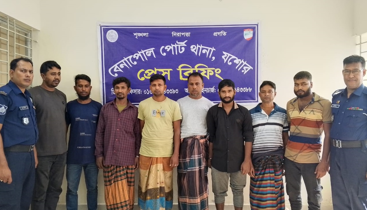 মঙ্গলবার (৫ নভেম্বর) বেনাপোল পোর্ট থানাধীন বিভিন্ন এলাকা থেকে তাদের আটক করা হয়। আটক আসামীরা হলেন, বেনাপোল বোয়ালিয়া পশ্চিমপাড়া গ্রামের মৃত চান্দালী কাজীর ছেলে মো. আবু বক্কর কাজী (৫০), পোড়াবাড়ী নারায়নপুর গ্রামের মৃত সোহরাব শিকদারের ছেলে মো. হাচান শিকদার, সাদিপুর গ্রামের মৃত আব্দুর রাজ্জাক এর ছেলে মো. শরিফুল ইসলাম (২২), বারপোতা গ্রামের আবু বক্কার সিদ্দিকের বড় ছেলে নুর মোহাম্মাদ (৪৫), ছোট ছেলে মোহাম্মাদ (৪১), ভবারবেড় গ্রামের মৃত ইউসুফ হাওলাদারের ছেলে কামাল হোসেন (২৫), পুটখালী গ্রামের মৃত আঃ সাগর মোড়লের ছেলে আরিফুল ইসলাম (২৪), একই গ্রামের মৃত আঃ ছাত্তার মোড়লের ছেলে মো. আরিফুল ইসলাম ও মো. আঃ ছাত্তারের ছেলে আরিফুল ইসলাম।