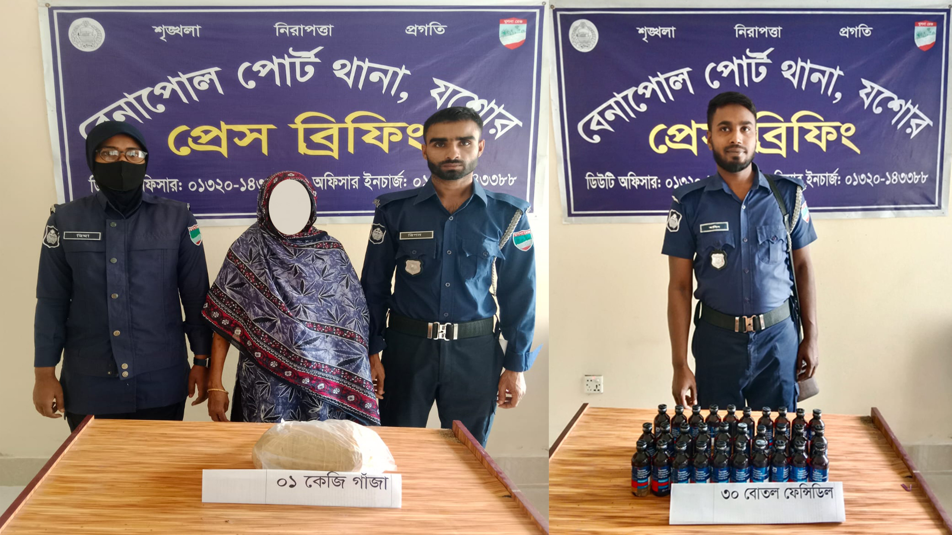 পুলিশ জানায়, প্রতিদিনের ন্যায় শনিবার দুপুরে বেনাপোল পোর্ট থানাধীন উত্তর বারপোতা গ্রামে বিশেষ অভিযান পরিচালনা করা হয়। এসময় পুলিশের উপস্থিতি টের পেয়ে পুটখালী রোডের পাঁকা রাস্তার উপর ৩০ বোতল ভারতীয় ফেনসিডিল ফেলে অজ্ঞাতনামা একজন আসামী পালিয়ে যায়। পরে সেখান থেকে ফেনসিডিলের চালানটি উদ্ধার করা হয়। একই দিনে গোপন সংবাদের ভিত্তিতে বাহাদুরপুর রোডস্থ বেনাপোল ৩নং ওয়ার্ডের হারুনের মুদি ও চায়ের দোকানের সামনে অভিযান চালিয়ে পাঁকা রাস্তার উপর হতে ১ কেজি গাঁজাসহ শিল্পী কে আটক করা হয়।