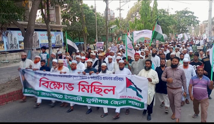 সোমবার (৭ এপ্রিল) বিকেলে বাংলাদেশ জামায়েত ইসলামী মুন্সীগঞ্জ জেলা শাখার উদ্যোগে জেলা কার্যালয় থেকে একটি বিক্ষোভ মিছিল বের করা হয়। মিছিলটি শহরের প্রধান প্রধান সড়ক প্রদক্ষিণ করে মুন্সীগঞ্জ আদালত প্রাঙ্গণ এলাকায় গিয়ে শেষ হয়। পরে সেখানে সংক্ষিপ্ত প্রতিবাদ সমাবেশে বক্তাগণ ফিলিস্তিনের গাজায় মুসলমান নারী, পুরুষ ও শিশুদের হত্যার তীব্র নিন্দা ও প্রতিবাদসহ ইসরায়েলী সকল পণ্য বয়কট করার জন্য আহ্বান জানান। পরে ইসরায়েলি প্রধানমন্ত্রী বেনজামিন নেতানিয়াহুর কুশ পুত্তলিকা দাহ করা হয়।