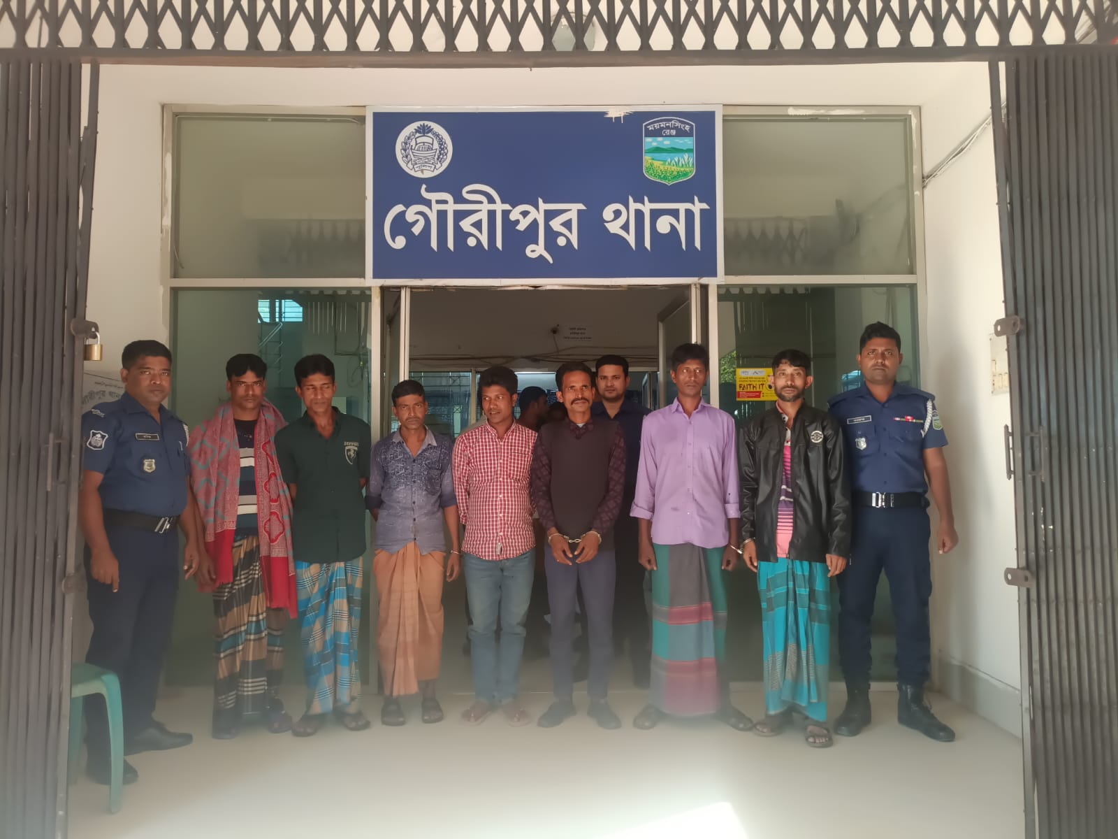 থানা সূত্রে জানা গেছে, গোপন সংবাদের ভিত্তিতে গৌরীপুর থানার এস আই রেজাউল করিম, এএসআই সালেহ আহম্মেদ নয়ন, আব্দুল হাদী সঙ্গিয় ফোর্স নিয়ে গোপন সংবাদের ভিত্তিতে উপজেলার মাওহা ইউনিয়নের ভূটিয়ারকোনা বাজারে অভিযান চালিয়ে ভূটিয়ারকোনা বাজারের মোহাম্মদ আলীর ছেলে মোঃ রাব্বি হাসান রাকিব, পাচকাহনিয়ার গ্রামের মৃত আঃ সালামের ছেলে মোঃ সুলতান, কেল্লা তাজপুর গ্রামের মৃত আবু সিদ্দিকের ছেলে মোঃ ফারুক মিয়া, বীর আহাম্মদপুর গ্রামের মোঃ আঃ হেলিমের ছেলে মোঃ নাছির, বীর আহাম্মদপুর গ্রামের মোঃ আঃ কুদ্দুছের ছেলে আঞ্জু মিয়া, কেল্লা তাজপুর গ্রামের মোঃ হাসান আলীর ছেলে মোঃ সুমন মিয়া ও বীর আহাম্মদপুর গ্রামের মৃত ইসমাইলের ছেলে মোঃ সৈইবত আলীকে আটক করে।