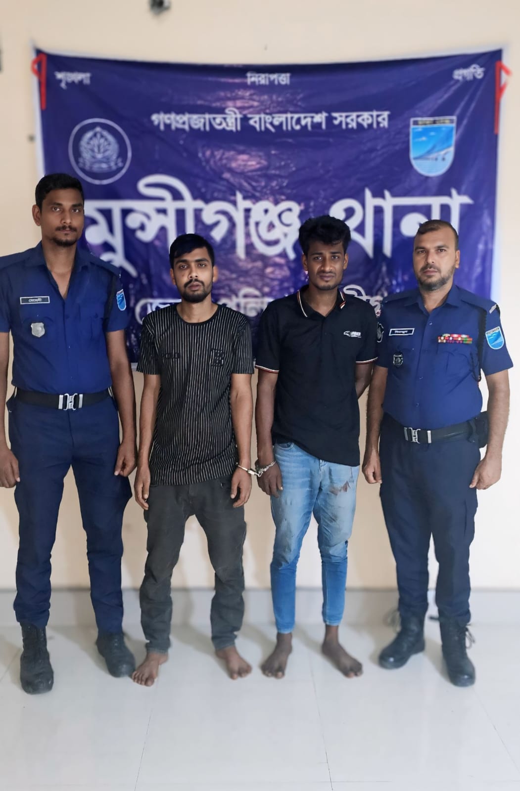 গোপন সংবাদের ভিত্তিতে গতকাল রাতে তাদেরকে আটক করে পুলিশের একটি টিম। আটককৃতরা হলেন, মো: আকাশ (২৪), পিতা মোঃ আবু কালাম, সাং- গোয়াল ঘূর্ণি (তালুকদার বাড়ি), মীরকাদিম পৌরসভা, ওয়ার্ড নং-০১, থানা ও জেলা মুন্সীগঞ্জ এবং অপর অভিযুক্ত মোঃ হোসেন ফকির (২৮), পিতা-মোঃ হানিফ ফকির, মাতা-হাসি বেগম, সাং-করফা (ফকির বাড়ি), থানা- স্বরূপকাঠি, জেলা-পিরোজপুর, বর্তমান ঠিকানা-সাং-গোয়াল ঘূর্ণি কাঠালতলা, মীরকাদিম পৌরসভা, ওয়ার্ড নং-০১, থানা ও জেলা-মুন্সীগঞ্জ’দ্বয়-কে গ্রেফতারপূর্বক বিজ্ঞ আদালতে সোপর্দ করে।