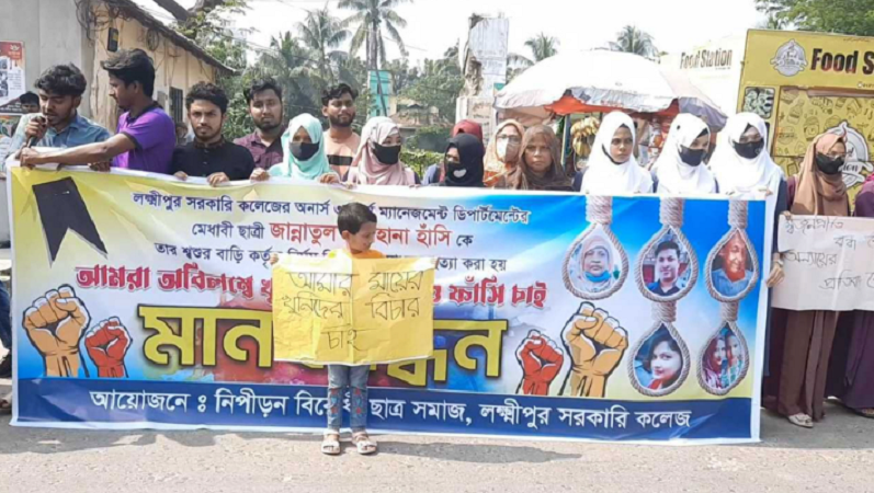 লক্ষ্মীপুরে ফেস্টুন হাতে মায়ের খুনিদের ফাঁসি চাইলেন শিশু সন্তান
